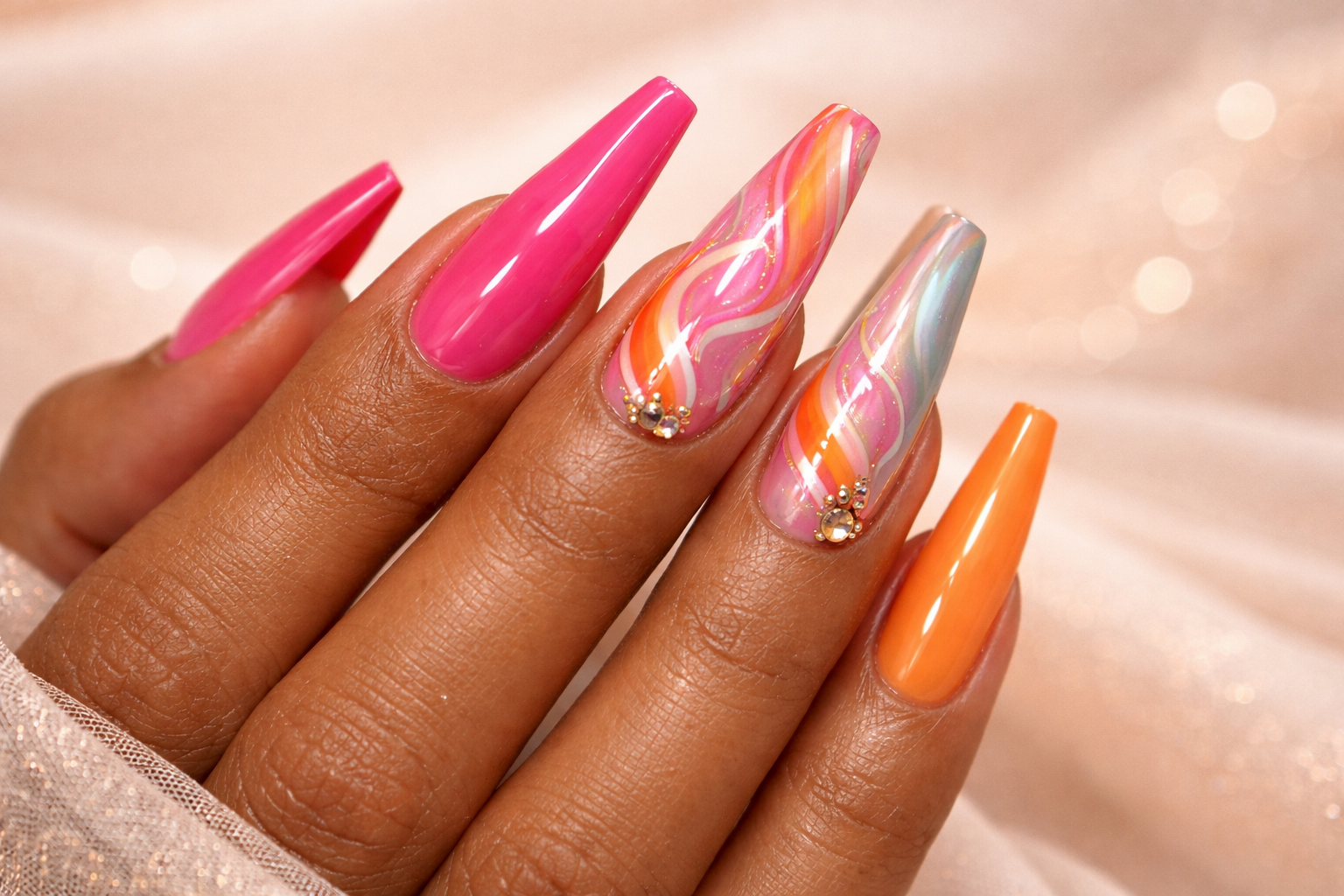 Gel nails are cured under LED/UV light for a shiny, durable finish that can last up to 3 weeks, while acrylic nails use a powder and liquid mix that hardens naturally and is ideal for extensions and custom shapes.